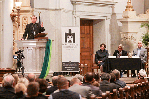 On Tuesday, November 7, Michigan Catholic Conference (MCC) and the J. Reuben Clark Law Society Detroit Chapter sponsored an Interfaith Religious Freedom Conference to explore the importance of religious freedom and ways to defend this cherished right. Most Reverend Allen Vigneron, Archbishop of Detroit, and Elder Von Keetch, General Authority and Executive Director of Public Affairs of The Church of Jesus Christ of Latter-day Saints, joined with several scholars of religious freedom in addressing the crowd of over three hundred people at SS. Peter and Paul Jesuit Church in Detroit. The event included representatives from almost a dozen faith traditions. To see pictures, media coverage, and resources from the event, visit the Michigan Interfaith Religious Freedom Conference page on Facebook. (Photo by Dave Frechette)