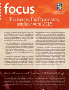 The themes of Catholic Social Teaching can be helpful in forming one's conscience and preparing for voting: 1) the Right to Life and Dignity of the Human Person, 2) Call to Family, Community, and Participation, 3) Rights and Responsibilities, 4) Option for the Poor and Vulnerable, 5) Dignity of Work and the Rights of Workers, 6) Solidarity, and 7) Caring for God's Creation. Within each principle, it is appropriate to reflect upon the role and level of government that should be involved in a given issue, as well as the personal responsibility Catholics have to uphold these teachings in their individual lives. Additionally, the U.S. Conference of Catholic Bishops (USCCB) instructs voters to consider the wide range of issues and Catholic teaching when evaluating candidates (not just be single-issue voters), while at the same time recognizing that issues have different moral weight to them (Catholics should never support intrinsic evils). Read The Issues, The Candidates, and Your Vote 2018 for further details.