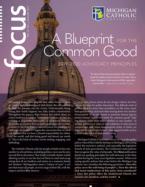 On Wednesday, January 9, 2019, state lawmakers of the 100th Michigan Legislature began their two-year session. During this time, Michigan Catholic Conference (MCC) will advocate for policies that promote the common good and respect the inherent dignity of all persons. MCC is committed to working with lawmakers of both parties on these critical issues for Michigan. Accordingly, MCC has issued A Blueprint for the Common Good, its guiding principles for advocacy in the new session. Policies of interest are categorized into subjects, including human life and dignity, preferential option for the poor and regulatory policies, religious liberty, education, children and families, health care, restorative justice, immigration and refugees, and care for creation. MCC will advocate especially for several issues, including:
